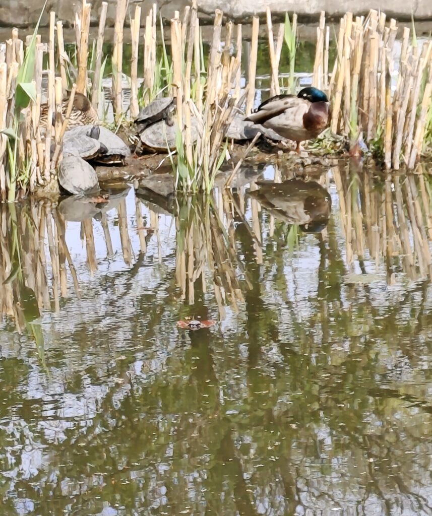 Pe malul apei, țestoasele stau aliniate pe bucăți de lemn uscat, absorbind fiecare particulă de căldură. Lângă ele, o rață sălbatică se odihnește într-un picior, nepăsătoare la trecerea noastră. Ne învață, fără cuvinte, că graba este o invenție umană de care natura nu are nevoie.